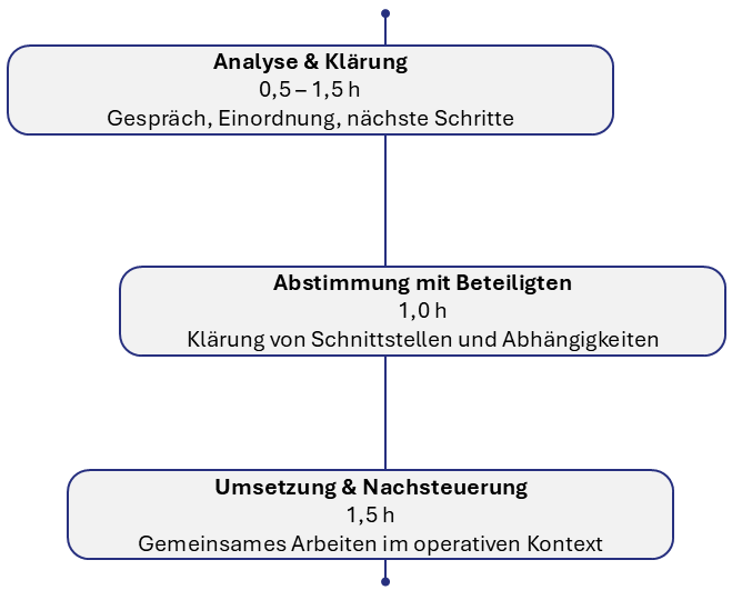 Strukturierte Klärung von Schnittstellen, fokussierte Deep Dives, erste Umsetzungsschritte, auch über mehrere Wochen.
