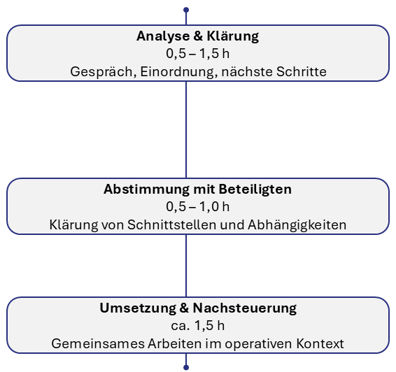 Sie sind kein neues Konzept und keine theoretische Beratung, sondern strukturierte Arbeitsphasen, in denen Analyse, Lösungsentwicklung und Umsetzung eng miteinander verzahnt sind.